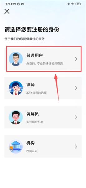 在身份选择页面找到普通用户选项并点击,随后进入服务主界面。