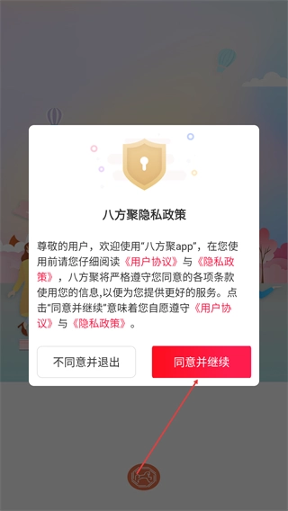 请您仔细阅读【用户协议】和【隐私政策】的具体内容,在确认无误后,点击【同意并继续】按钮,即可进入“八方聚”的后续操作流程。