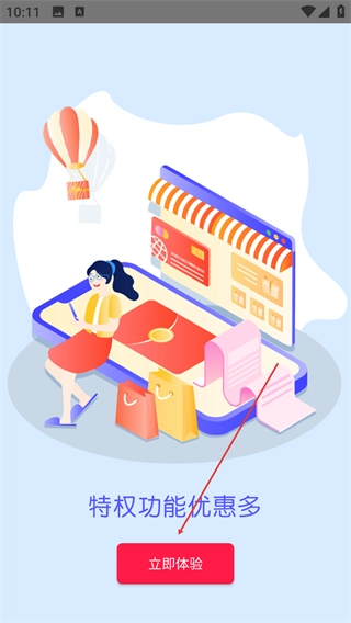 在应用的引导页面,点击【立即体验】按钮,即可进入应用主界面,进而使用其特权功能和优惠服务。