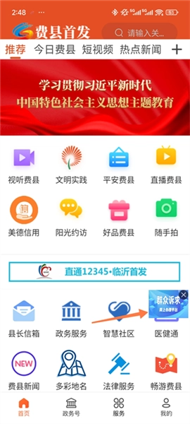 设置了今日费县、热点新闻、微视频、直播等专栏。