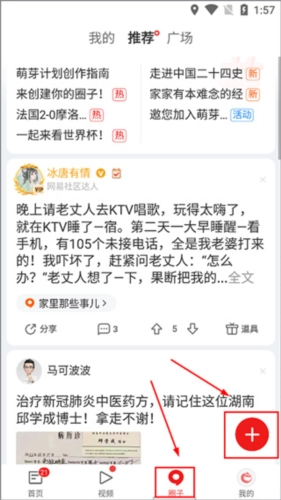 打开网易新闻并登录账号,接着点击页面底部的【圈子】选项,进入圈子页面后,点击界面上的【+】图标,就能发布动态了。