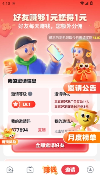 在邀请页面,你可以借助分享邀请的途径来获取更多红包奖励。