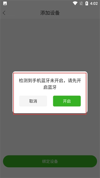 在执行添加设备的操作过程中,要是出现【检测到手机蓝牙未开启-请先开启蓝牙】的提示,你可以点击【开启】按钮来启动蓝牙,这样就能继续完成设备绑定的流程了。