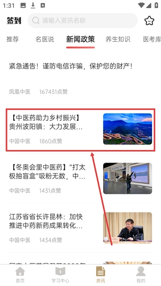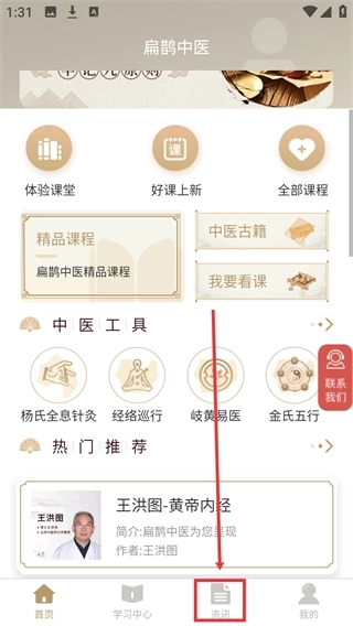 在【扁鹊中医】首页底部,找到并点击【资讯】按钮,即可进入资讯页面。