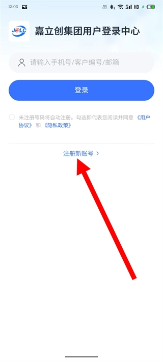 在登录中心页面,点击注册新账号,进入注册新账号页面。