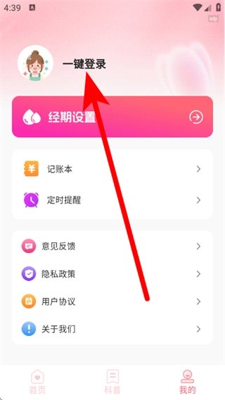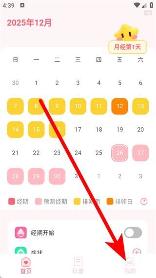 在姨妈小记页面,点击底部的“我的”选项,即可进入个人页面。