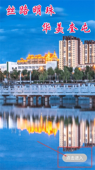 当看到包含【丝路明珠-华美奎屯】文案的页面时,点击该页面上的【点击进入】按钮,就能进入软件的主界面。