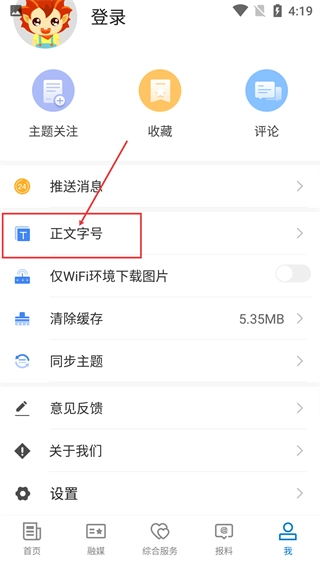 在个人页面里,找到【正文字号】选项并点击它,这个选项能用来调整软件内正文内容的显示字号大小。