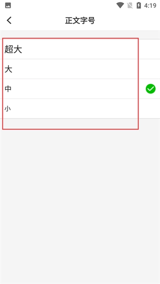 进入【正文字号】页面后,可在【超大、大、中、小】这几个选项里选择适配的字号,当前页面默认选中的是【中】字号。