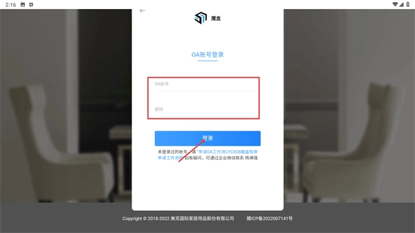 若选择【OA账号登录】方式,需填写OA账号及密码后点击【登录】按钮;首次使用的账号需先申请权限,如有疑问可联系指定人员咨询。