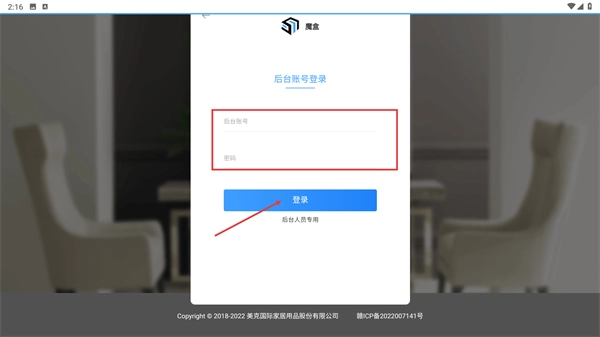 若选择【后台账号登录】选项,需在对应的登录页面准确填写后台账号和密码,随后点击【登录】按钮,以此完成后台人员的账号身份验证流程。
