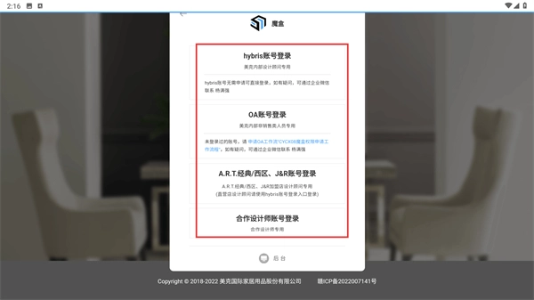 进入“魔盒”应用的登录选择界面后,能依据自身身份挑选对应的登录类型(像hybris账号、OA账号之类),不同的登录类型分别对应不同的使用人员群体。
