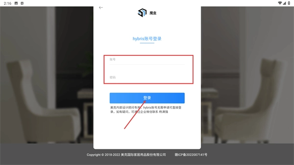 若选择【hybris账号登录】选项,填写对应的账号和密码后,点击【登录】按钮即可完成登录操作,该账号仅限美克内部设计顾问使用。