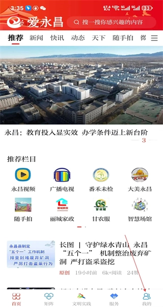 打开爱永昌软件的首页后,能看到推荐资讯之类的内容,接着点击底部的“我的”选项,就可以进入个人中心页面了。