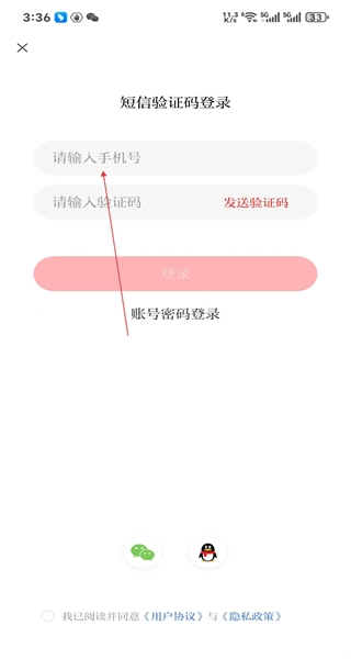 进入短信验证码登录界面后,需准备填写手机号码与验证码,此外还能通过第三方账号完成登录操作。
