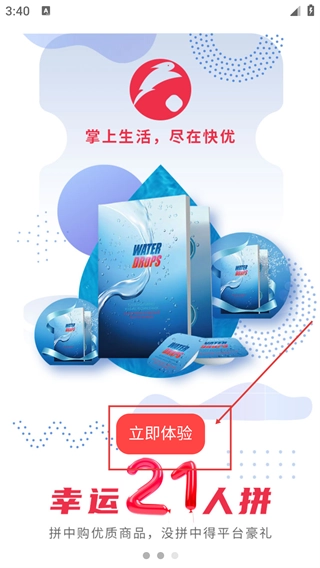 快优拼是一款主打拼团购物的生活服务类应用,其引导页核心规则为“拼中即可购买商品,未拼中则能获得平台豪礼”,用户点击【马上体验】按钮即可开启使用。