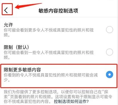 成功后点击【返回】,设置【限制更多敏感内容】成功