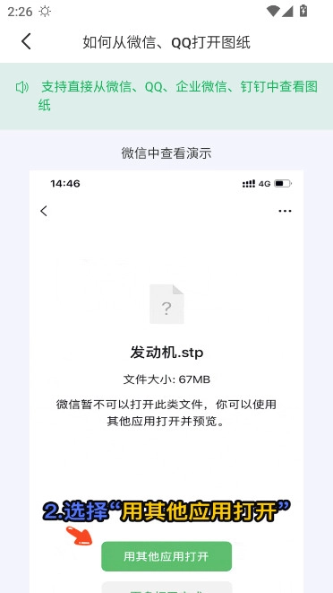 3D看图王支持直接从微信、QQ、企业微信、钉钉里查看图纸,手机端的用户们可以按照下面的图示步骤来操作,就能完成图纸打开的流程。
