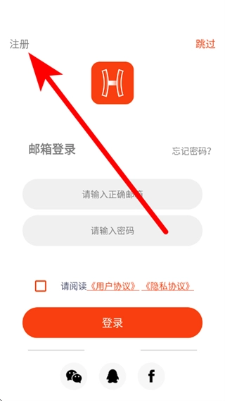 在登录页面,点击左上角的注册选项,进入邮箱注册页面。