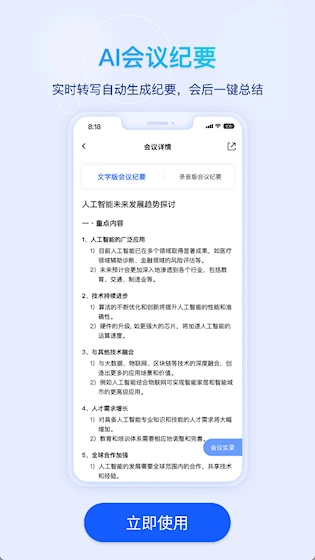 自动生成会议纪要:在会议开展期间自动记录核心要点,并梳理成条理清晰的文本形式,方便会后查看或分享给未能参会的人员。