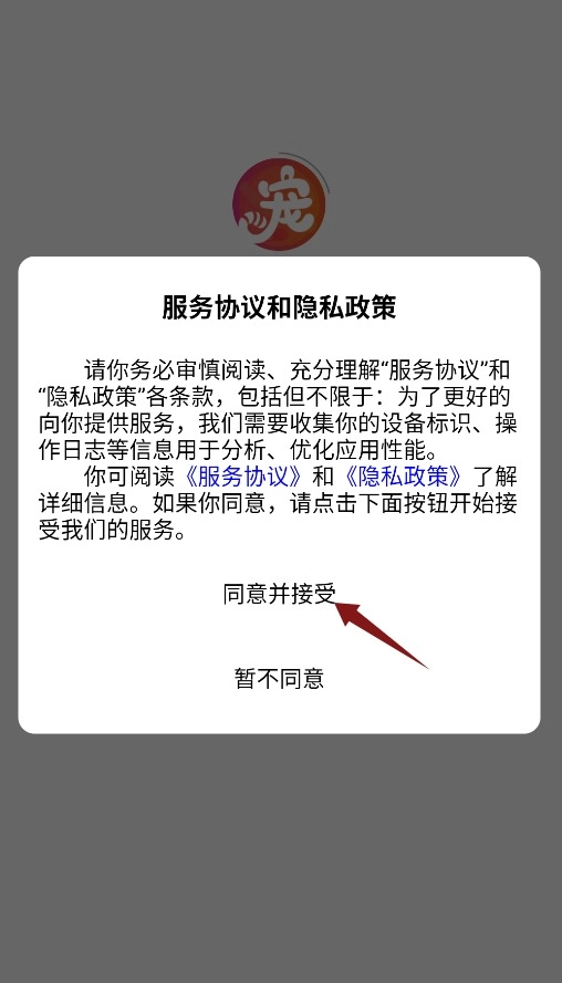 首次打开应用时,需要点击确认弹窗中的协议,同意之后才能进入主界面。