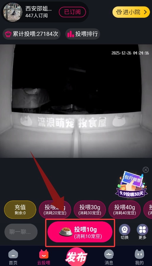 云喂养界面设有投喂按钮,点击该按钮即可达成远程互动喂养的功能。