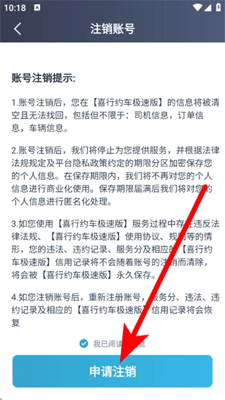 在账号注销页面,先勾选“我已阅读”,再点击“申请注销”按钮,即可完成账号注销操作。