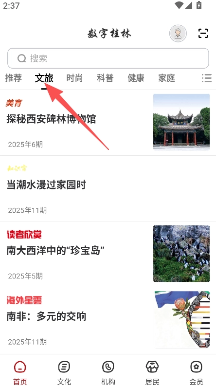 支持分类筛选功能,在居民页面点击“文旅”选项,即可查看该分类下的文章列表内容。