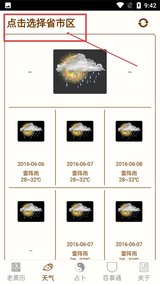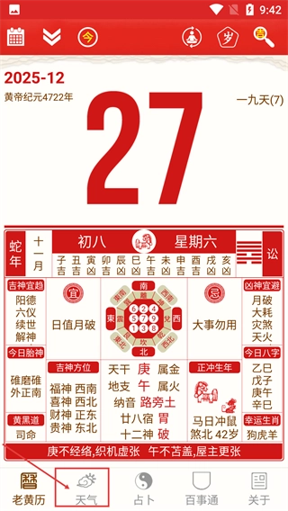在【老黄历万年历】的主界面上,能够查看当天的黄历信息,点击底部的【天气】按钮,就能进入天气功能页面,获取与气象相关的内容。