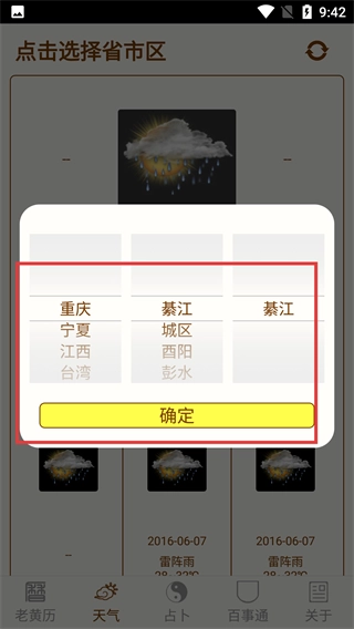 在省市区选择弹窗里,选定【重庆】这类目标地区选项后,点击下方的【确定】按钮,就能加载该地区的精准天气数据了。