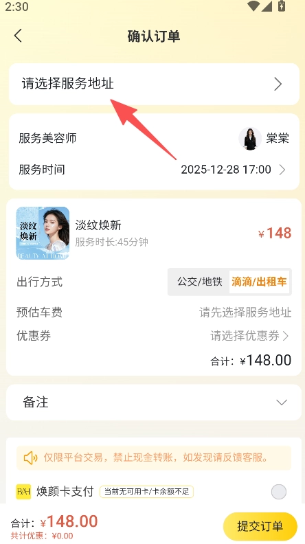 确认订单页面集成了服务地址与时间的选择功能,同时展示项目价格,支持出行方式的挑选,并完善了整个下单流程。