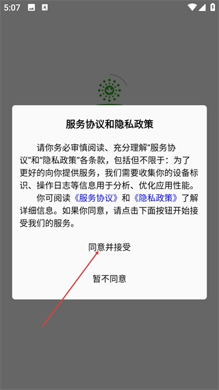 进入应用后,请仔细阅读《服务协议》与《隐私政策》的相关条款,点击【同意并接受】按钮,即可继续使用本服务。