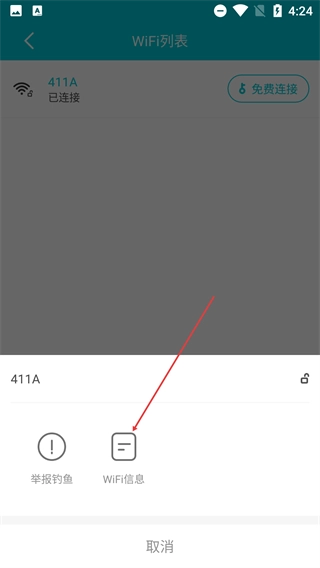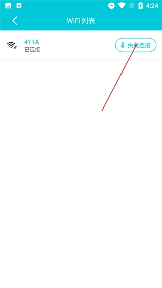 在WiFi列表页面,找到已连接的【411A】WiFi,点击其右侧的【免费连接】按钮,即可完成网络连接的操作。