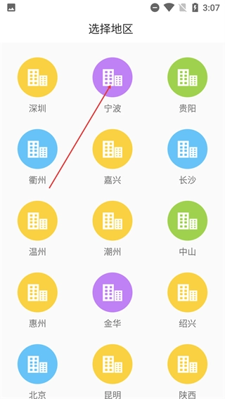 进入【选择地区】界面后,点击对应的城市图标(例如【宁波】),完成地区选择即可继续后续操作。
