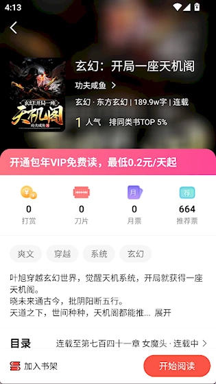 作品详情页面设有加入书架和目录查看功能,点击即可开始阅读。