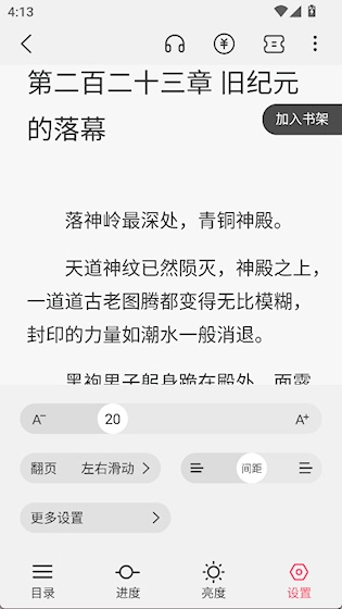 个性化阅读配置:可调整字体大小、背景色、亮度以及翻页模式,配备护眼和夜间模式,增强长时间阅读的舒适感。