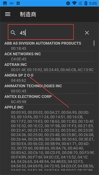 在搜索框中输入目标内容(例如“45”),系统会自动进行匹配,并呈现出包含该标识的制造商相关信息。