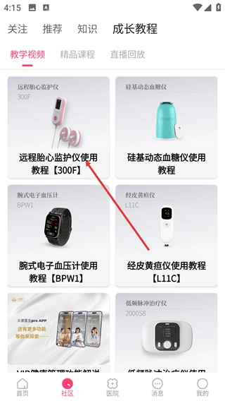在成长教程页面的【教学视频】分类里,能够选择像【远程胎心监护仪使用教程-【300F】】这类工具教程。