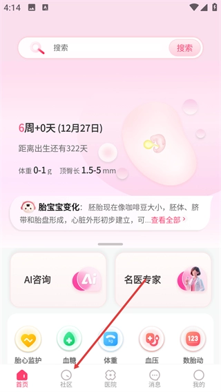 进入首页就能看到胎宝的孕周信息(例如【6周+0天】)以及发育数据,点击底部的【社区】按钮,即可进入孕期交流的板块。