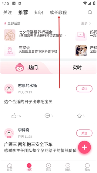 在社区页面,能够切换【成长教程】等分类,这个板块会提供孕期相关的知识以及经验分享内容。