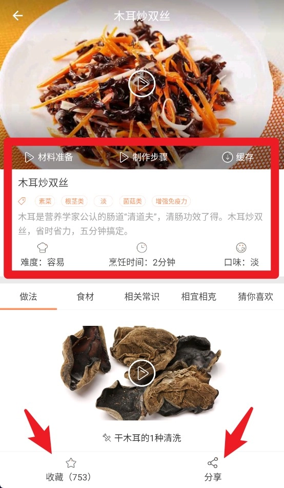 菜谱详情页会呈现食材、步骤、风味等内容,用户能够执行收藏和分享的操作,并且可以观看食材准备的视频。