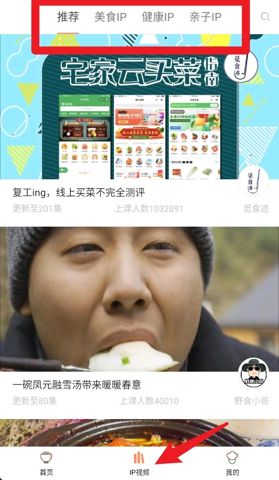 IP视频频道涵盖推荐、美食IP、健康IP、亲子IP等类别,点击底部的IP视频即可查看相关内容。