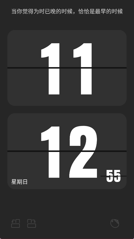 打开后会呈现醒目的翻页时钟效果,点击左下角即可切换至横屏模式