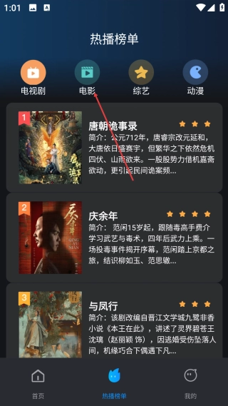 在热播榜单页面,点击【电影】分类选项,即可进入电影类热播内容的展示界面。