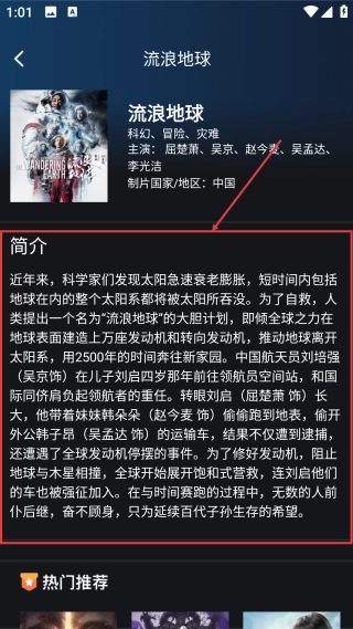 在流浪地球详情页,就能查看影片的【简介】与相关信息,进而了解作品的详细内容。