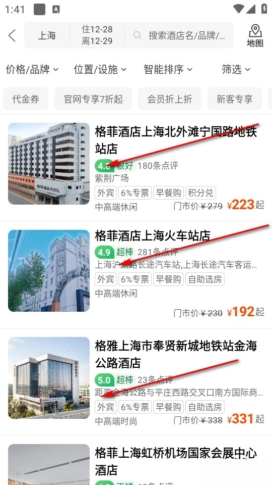 然后出现搜索结果,我们选择一个想要入住的酒店。