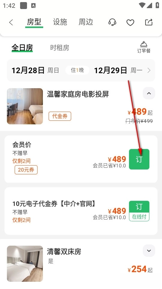 点击这些酒店进入详情页,便能查看该酒店的基础信息与相关客房,挑选一间客房后点击“订”字即可完成付款订房。