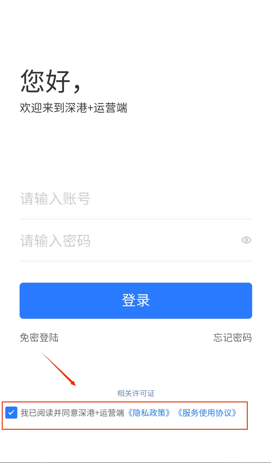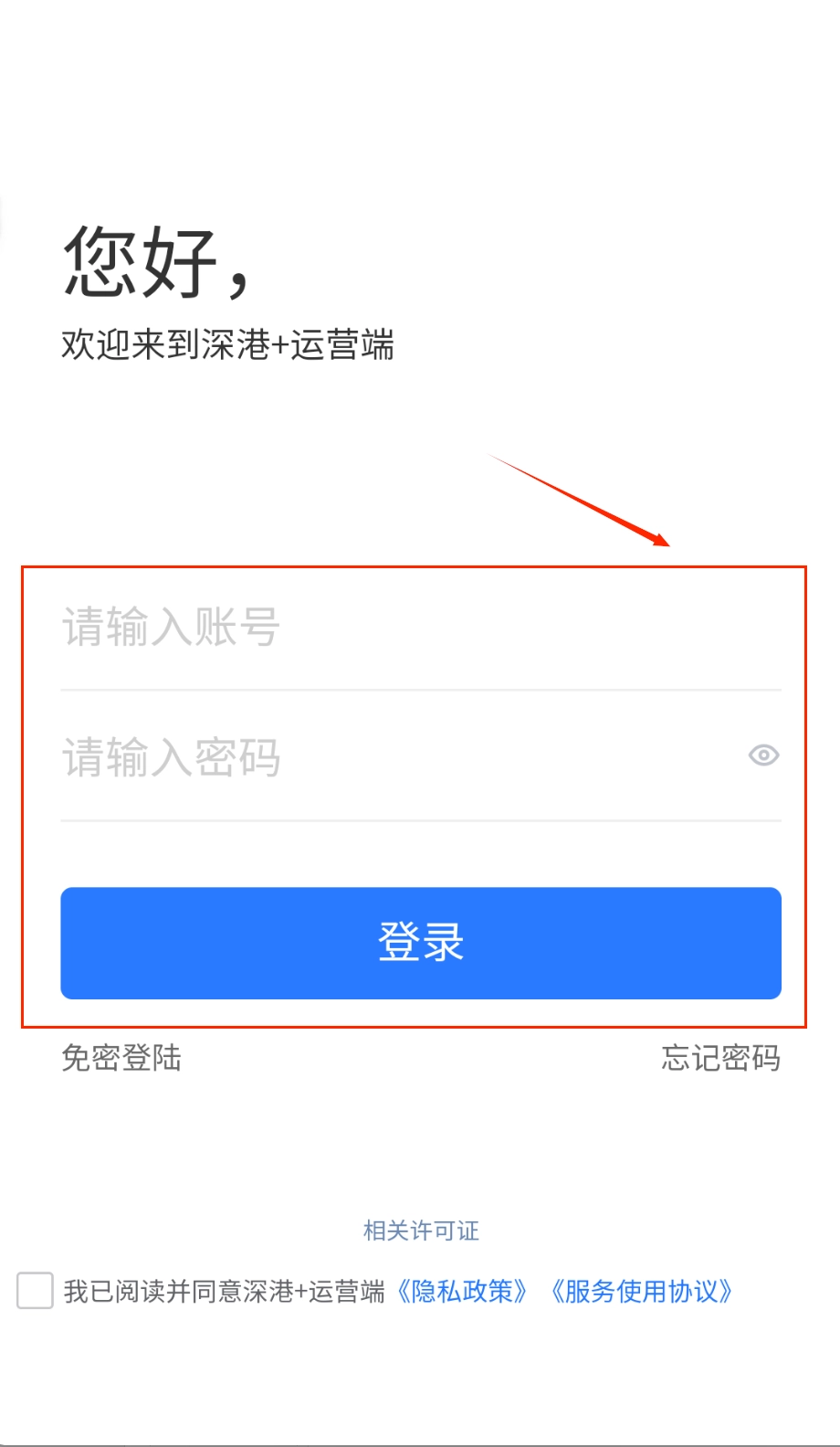1、打开进入登录页,顶部显示"您好,欢迎来到深港+运营端"问候语,下方是账号密码输入框呀。密码框右侧眼睛图标可切换显示哦。