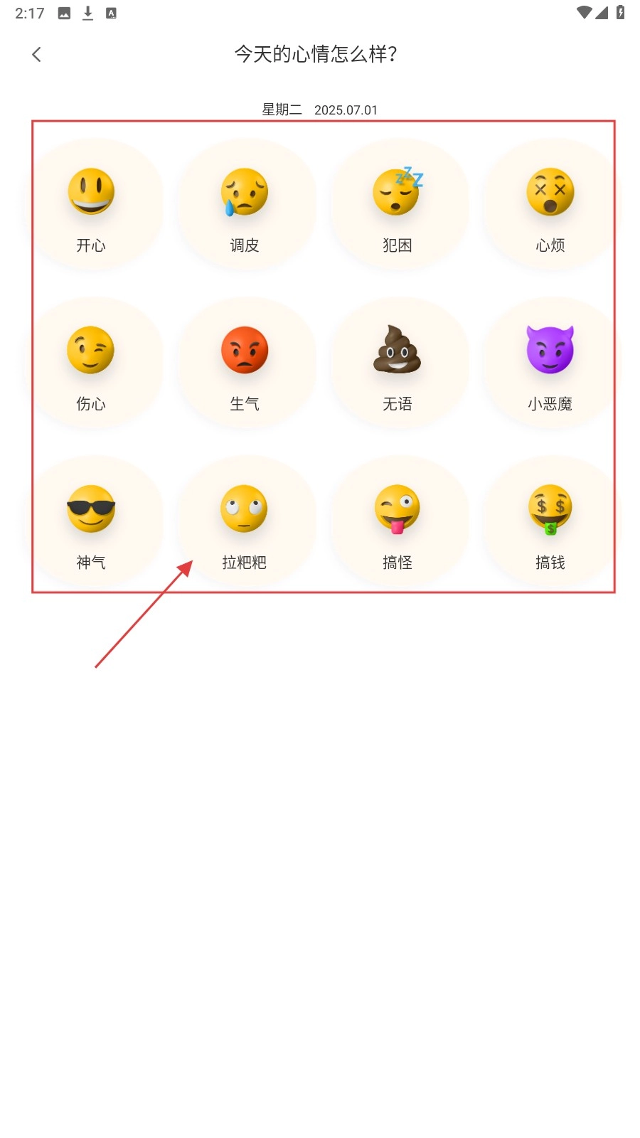 2、进入心情选择页面后,挑选出当天对应的心情,例如【开心】。