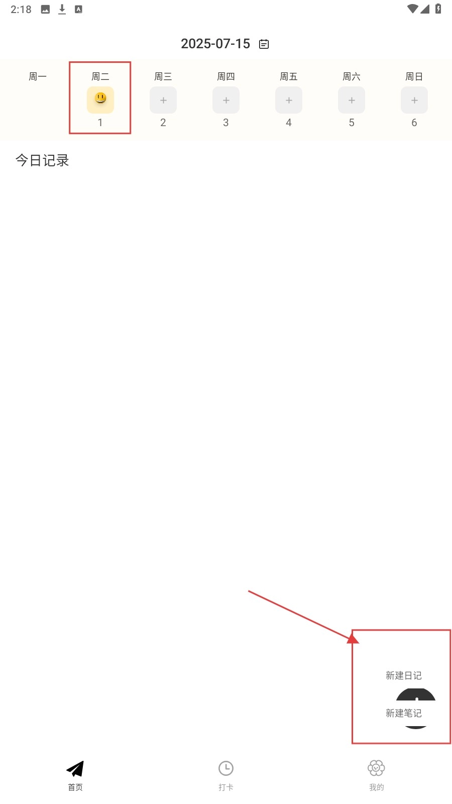 1、打开应用后,点击日期选择区域,挑选需要记录的日期,例如【周二-1】。